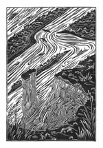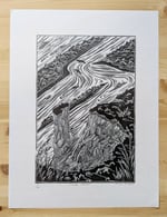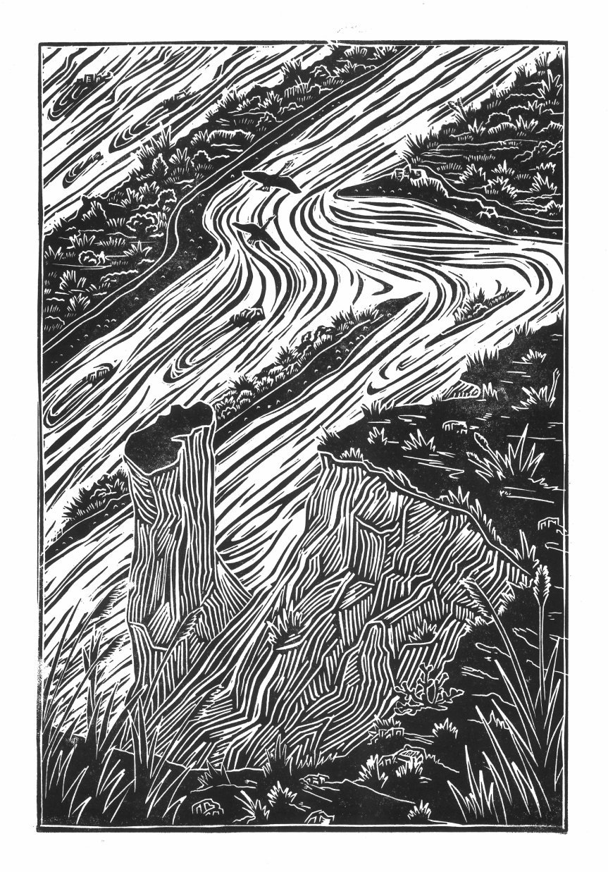 This is an original hand carved and printed linoleum block print featuring 'Coulee Lookout'. Printed on Japanese Masa Kinwashi rice paper (140gsm).