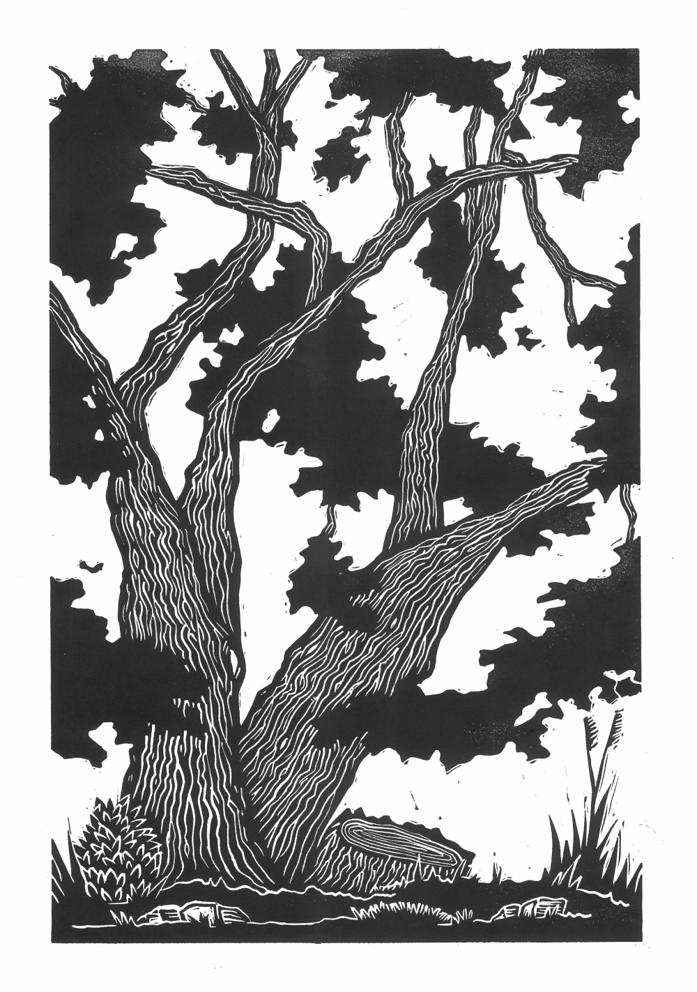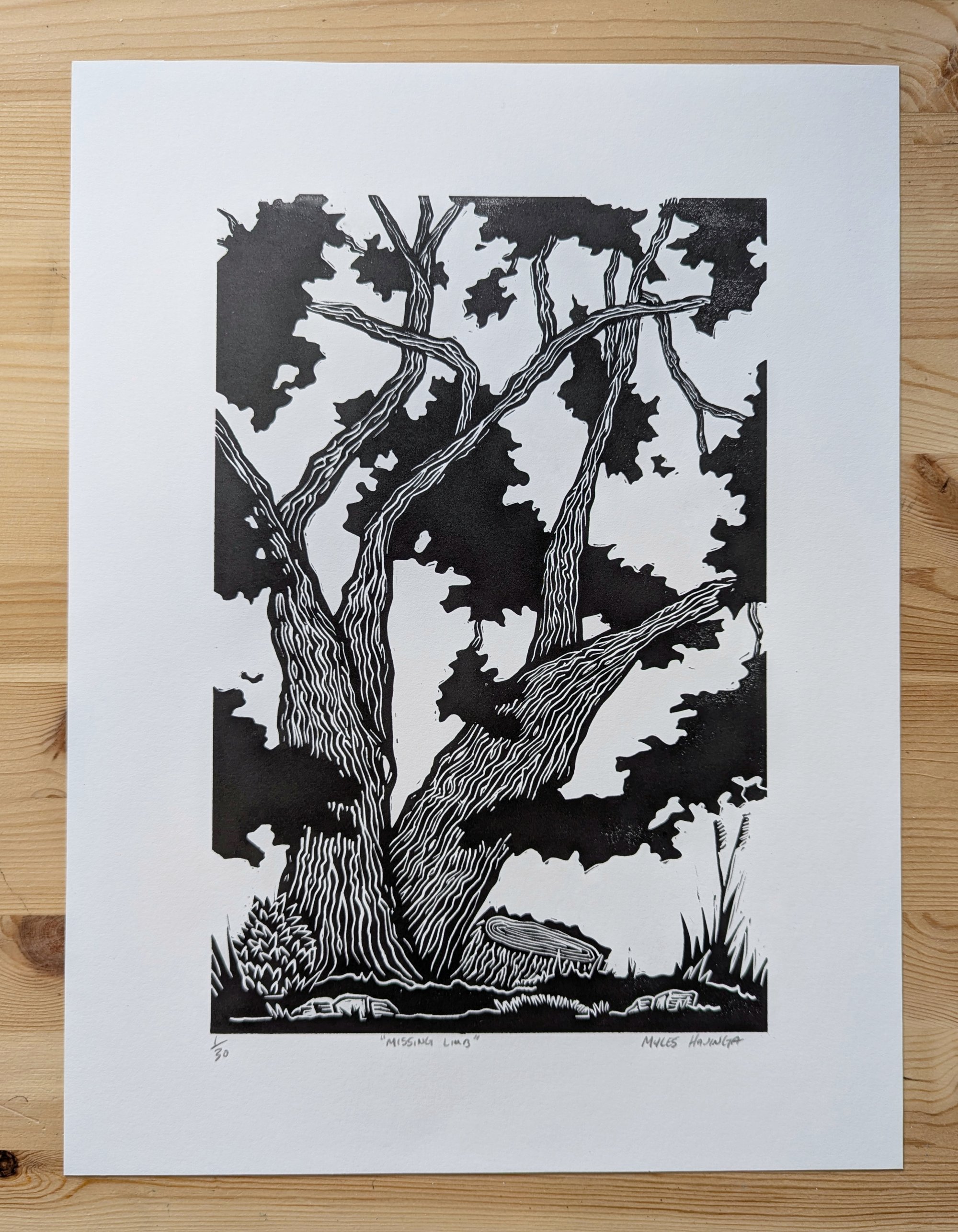 This is an original hand carved and printed linoleum block print featuring 'Missing Limb'. Printed on Stonehenge paper (250gsm).