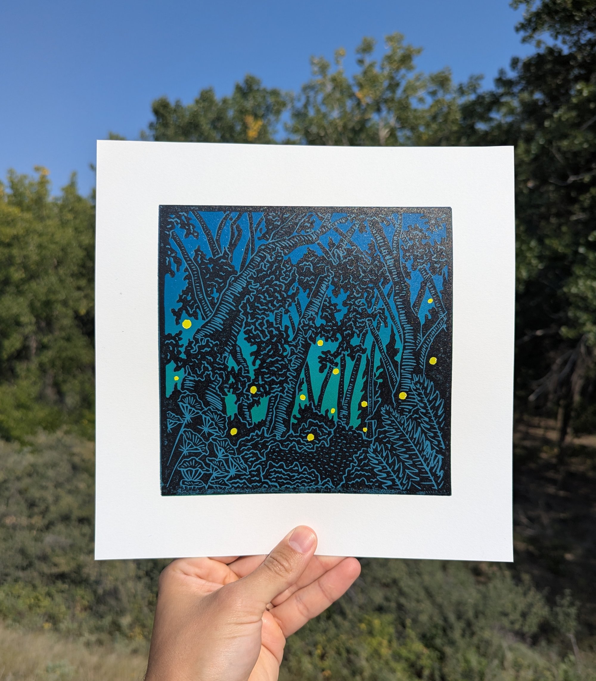 This is an original hand carved reduction linoleum block print with 4 colour layers. Printed on Stonehenge 100% Cotton (250gsm) white paper.
